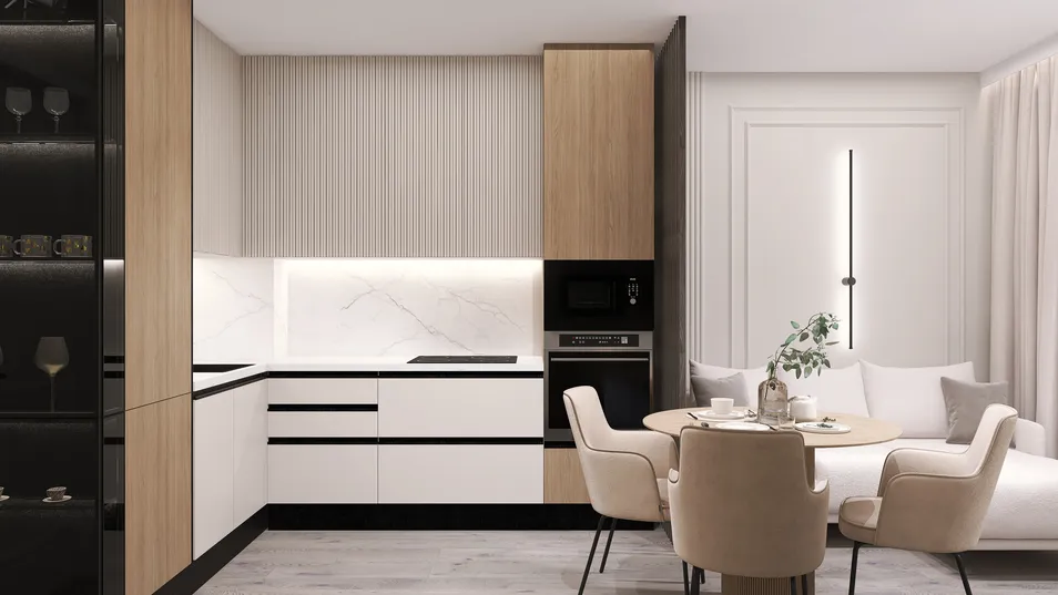 2 комнатная квартира с просторной кухней. В процессе проектирования. Это самый первый вариант, цвет и свет еще не утверждены. Пожелание клиентов, светлый интерьер с элементами под дерево. Без ярких акцентов.