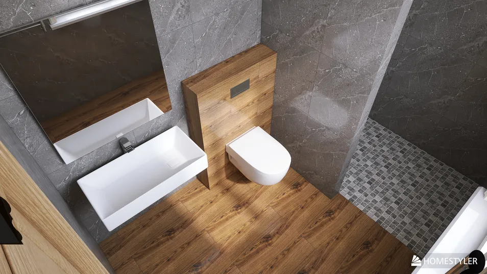 Санузел с душевой, она ограждена стеной не до потолка. Раковина, полотенцесушитель водяной и инсталяция.
