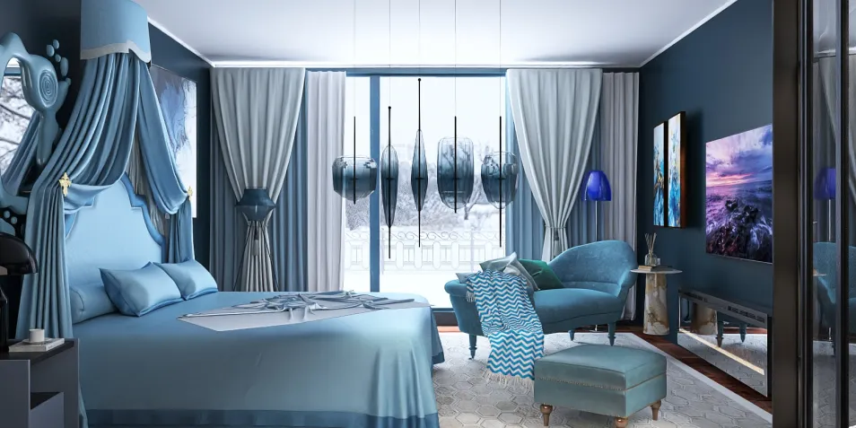 lindo quarto de casal azul um espaço com tv e lareira muito acolhedor para o inverno 🩵🩵💙🩵
