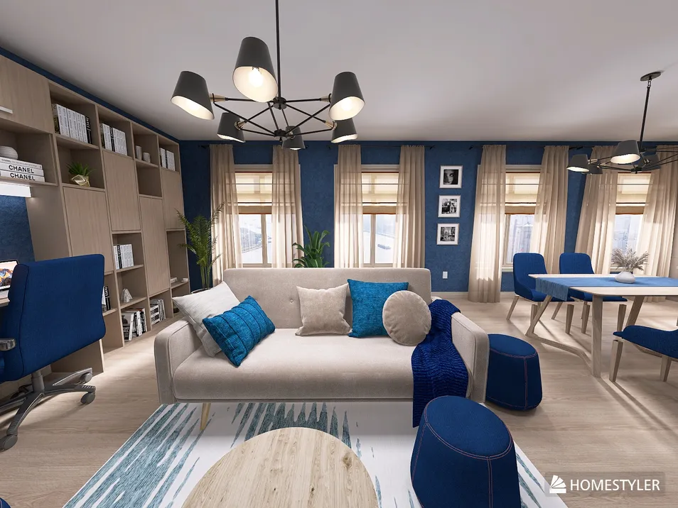 The apartment exudes an air of elegance and boldness, perfectly tailored for a family with children. The sapphire and taupe color palette creates a harmonious balance, with delicate taupe accents complementing the sophisticated blue backdrop. Plush furnishings invite comfort, while carefully curated decor pieces add a touch of refinement. Playful yet chic, the space seamlessly blends functionality with style, ensuring that every corner is both beautiful and family-friendly.