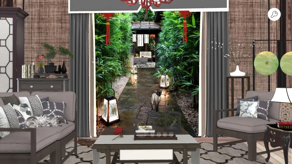 Eclectic living room and outdoor seating area with firepit inspired by the Asian subcontinents. Several design items are imported from Indonesia (decorative gongs, furniture and pillows), China (tea set, wall hangings, lighting and calligraphy art), India (characteristic elephantine outdoor floor lamps) and Japan (bonsai and the small cherry blossom plant). Original Template Credit: Zero Zero.