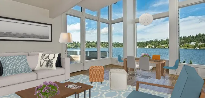 The Blues in the room get pulled from the gorgeous ocean outside the windows. The oranges are just there for a POP of color.
