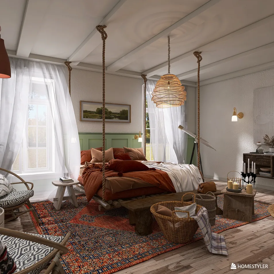 about the project: This bohemian bedroom was designed to capture the spirit of comfort, creativity and tranquility. Inspired by natural elements and rustic textures, the space is a harmonious combination of warm colors and organic materials, creating an environment that is both welcoming and aesthetically appealing.