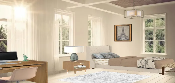 This is a boho bedroom if ive ever seen one. I have never done a Boho bedroom I also do not have a boho bedroom so this was new territory for me. The medium wood works really good next to the faded colors and ultra light blue accents. The picture of the Eiffel tower has a frame that perfectly matches the wood of the desk and night table.