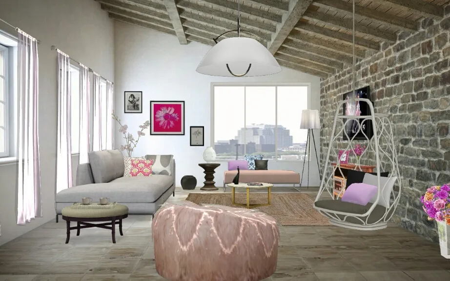 electic design of a city rooftop living room,contest challenge-I choose pink cos pink is always bold and I whanted to be brave (haha) so I didnt use any wall colours but still get the efect