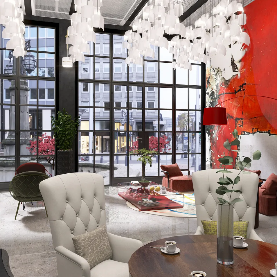Amidst the cascading glow of translucent petals, the room breathes life. A vivid mural erupts like a heartbeat, contrasting with the gentle hum of whispered conversations, where every corner reveals a story waiting to unfold.