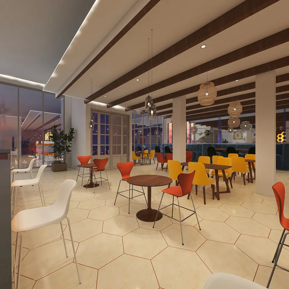 Honey and apiculture-inspired cafe. Hexagonal features, beehive-inspired lighting fixtures, dark wood features, and a honey-inspired colour scheme.
