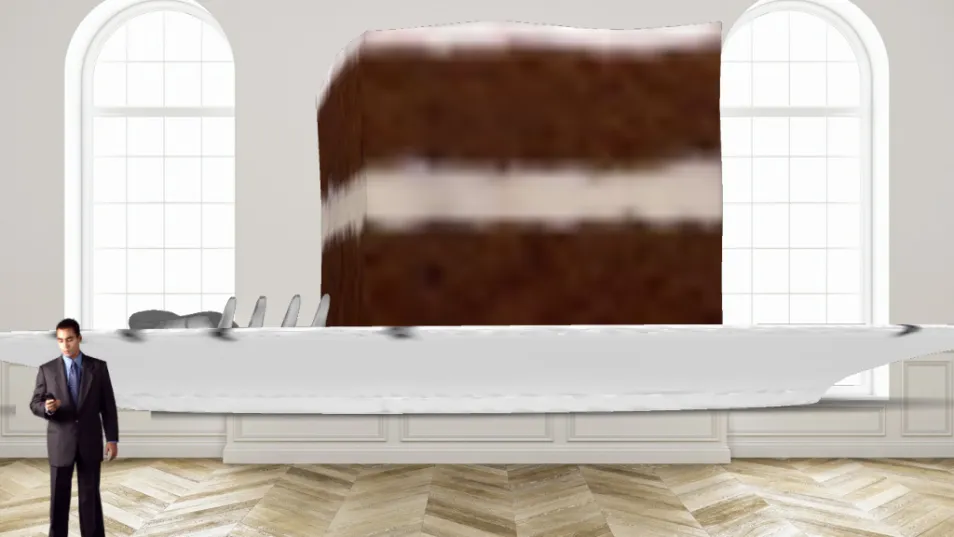 This is a SUPER BIG piece of cake and a person who is wondering, "Can I eat this?"