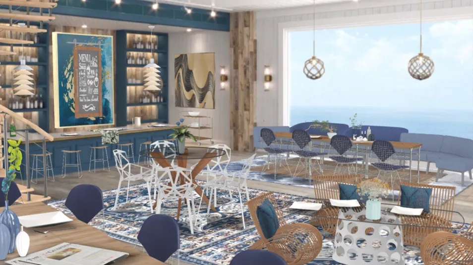Eclectic restaurant seating in a meeting of blue and natural woods 💙🤎