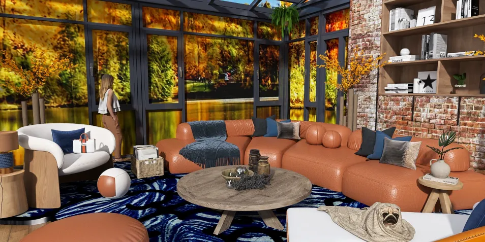 Terra cotta couch, white chair, textured rug and a throw blanket 🧡🍁🧡