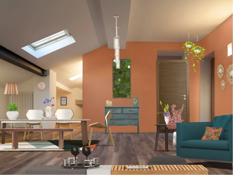 I drew my inspiration from this beautiful autumn colored paint that I created as an accent color for the room and the multicolored rug.