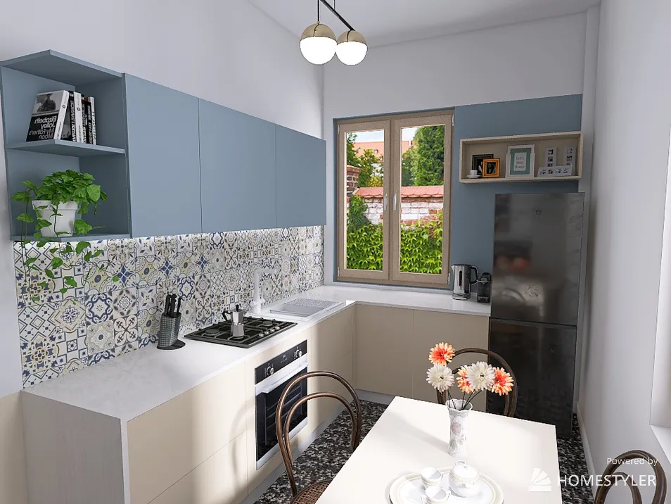 una raccolta ma funzionale cucina in un appartamento di campagna, nella provincia di Milano Est. Colori delicati e neutri che valorizzano il preesistente pavimento alla veneziana e le maioliche dal sapore d'altri tempi. I colori sono stati ripresi anche sulle pareti per un maggior senso di continuità, in virtù anche di ridimensionare otticamente l'ambiente, fortemente sviluppato in lunghezza