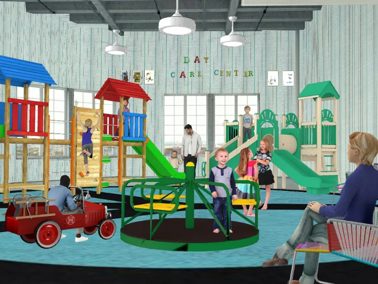 kids playing inside indoor playground at day care.