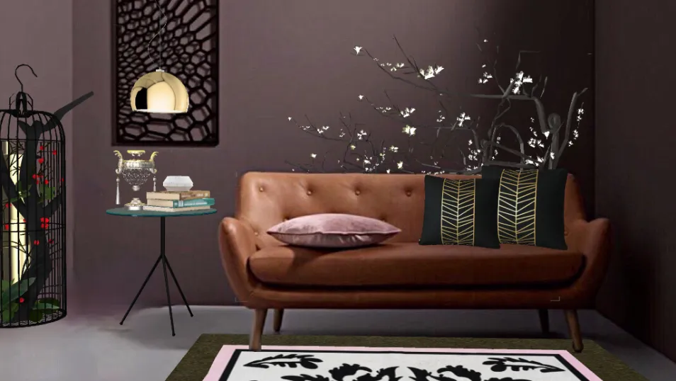 Feminine glam living room corner with a floral mural for an introverted bibilophile. Template Credit: Zero Zero.