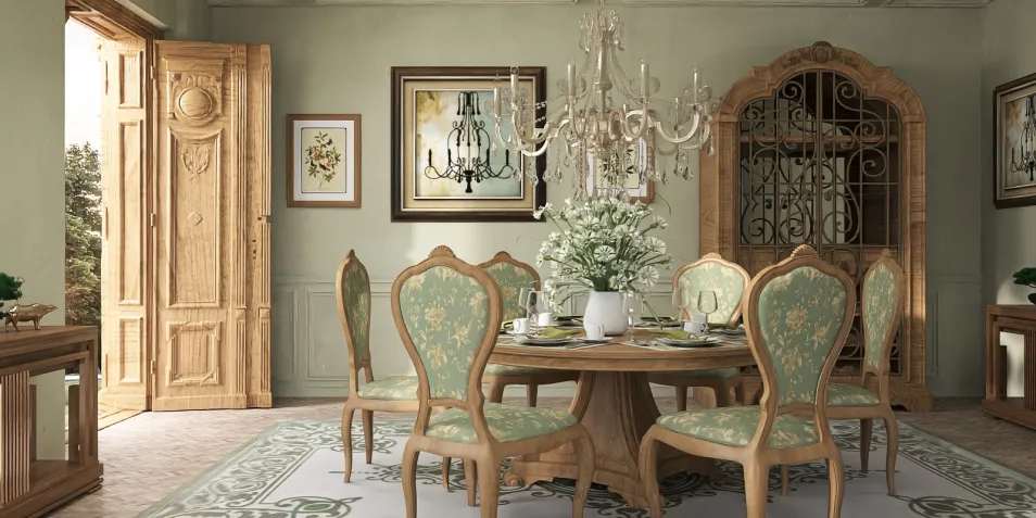Retro dining room style in a pleasant pastel green color with wooden elements