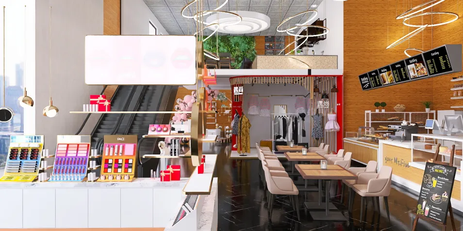 Shopping center estabelecimento comercial com tipos de serviços cinema, lojas, restaurantes e caffeteira para passeio em família e amigos