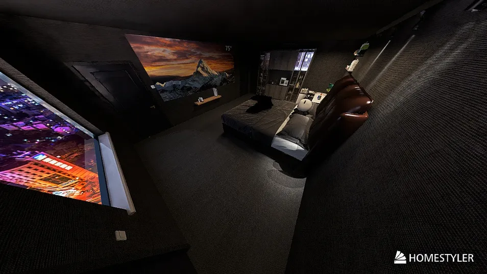 An interesting twist on what you would consider your "Dream Bedroom." What should be a 75" TV is more of a 13' 2" TV, a dream many people might wish for if they didn't have kids, Plenty of gaming consoles and a large California king sized bed with a personal desk and ready closet for you. Fit with a option between a dimly lit room or a brightly lit room, suitable for the relaxing parent or hyperactive kid, this room is meant for anyone.