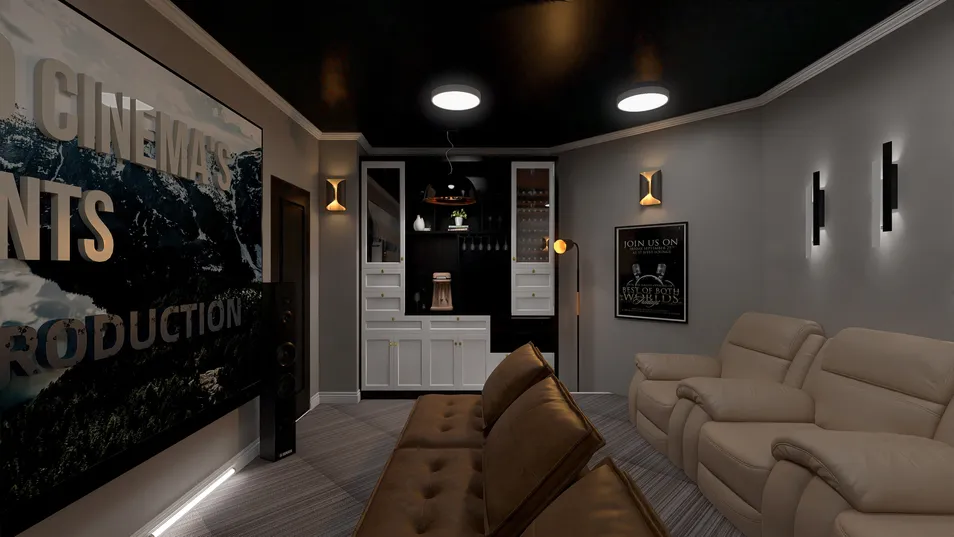 Reel talk… this space deserves an Oscar This cinematic escape is anything but flat. Designed to bring big-screen energy to everyday living, this home theater layers in plush recliners for main character comfort, surround sound that speaks volumes, and a built-in bar that’s always on tap for a sequel. Custom millwork and moody lighting add a little set design magic, while under-glow LEDs bring the floor-show feels. It’s not just a room—it’s a whole production in every direction.