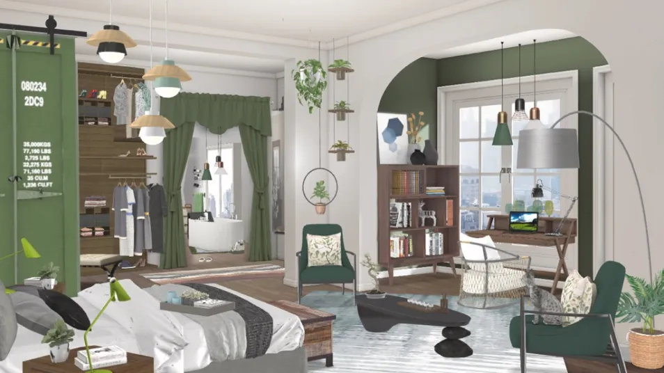 Busy but soothing 💚🤍🍃 office, bath, closet, bed, and a bit of sitting all in 1!