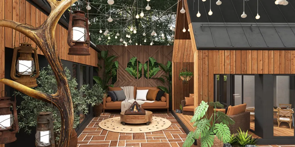 This outdoor living space effortlessly combines natural charm with modern comforts. The wooden paneling on the walls and roof sets a warm, inviting tone, while the tree branch adorned with hanging lanterns adds a touch of whimsical rusticity. Lush greenery surrounds a cozy seating area, featuring a sofa with plush pillows and a soft blanket, perfect for unwinding. At the center, a sleek geometric fire pit rests on a circular rug, serving as both a functional and aesthetic centerpiece. The herringbone-patterned brick flooring adds a subtle texture beneath. Overhead, string lights twinkle like stars, creating a magical ambiance for evenings spent under the open sky. This name and description blend the cozy, enchanting vibe with the polished, modern elements of the space.