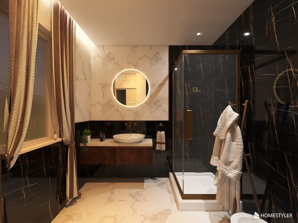 ILuxury black bathroom inspired by high-end hotel suites, designed to achieve the perfect balance between materials, light and reflections. Satin black marble surfaces, brushed gold accents and soft evening lighting create an intimate and elegant atmosphere.
