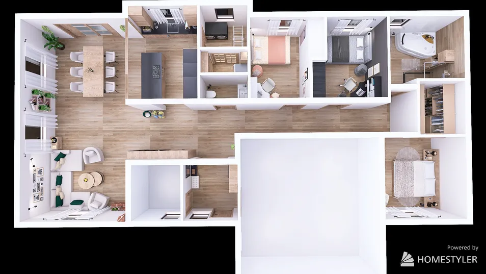 Functional 1 floor family home with open plan, 3 bedrooms, 2 bathrooms and big garage for 2 cars.