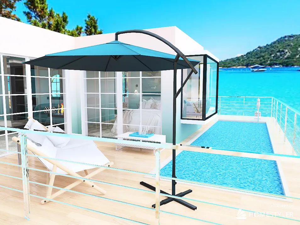 Glamping is the new way to camp! Confort and glamorous style are possible not only at your own home but also on vacation. This is a new concept of floating house: not a boat but really a 360° concept of living surrounded by waterworld. Luxury doesn't always need to be fulfilled with objects and decor, a minimal and easy-to-use space can also be precious. The shaded walls with their turquoise base floating towards sable top an then again a bluegreen ceiling symbolize water joining with earth and are relaxing by daytime and create intimacy and confort by night. Dive into my floating water-home!