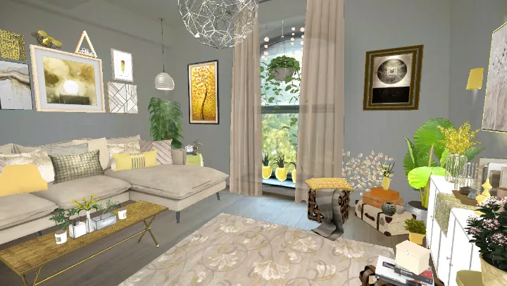 🌻🌻An eclectic livingroom with a collection of golden yellow accents, in simple neutrals, with lots of fresh greenery.🌻🌻
