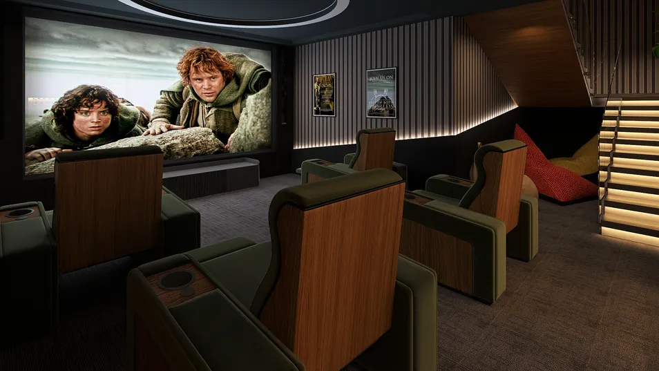 A room in a basement, utilized to the max. It's a fully functional home cinema with massage recliners, a game room with Sony 5 & bean bags, and an entertainment space with a wet bar. The floor is covered with a carpet for acoustics and the walls are soundproofed.