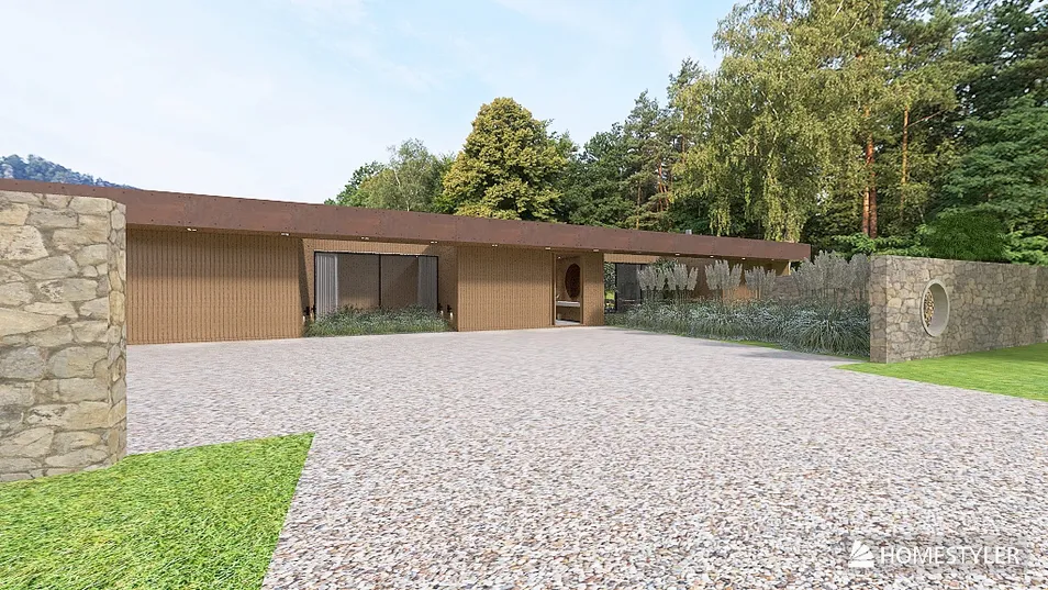Project for a single-storey family house with 4 bedrooms all with suite, living and dining room and integrated kitchen, laundry and storage area, hall with guest toilet, terrace with barbecue area and surrounding garden with swimming pool in the rear area.