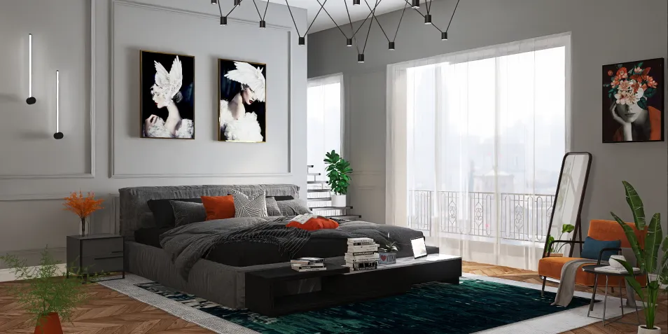 This industrial style with neutral greys and blacks and pops of orange along with a very gorgeous emerald green rug everything ties in PERFECTLY with the art on the right wall🖤🩶🧡 It is perfect for the eyes and of course a lovely functional layout👌
