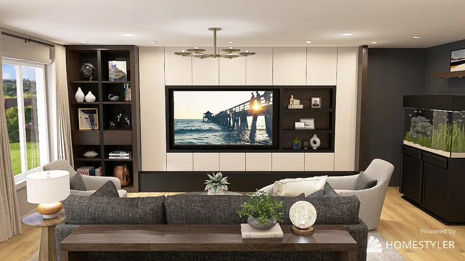 This is a design for completing and unfinished basement in a simple and functional style, with a large gaming table for tabletop games, an entertainment space to unwind and watch movies, a bar area for snacks, and an already-owned fish tank needing to be incorporated into the design. The basement needed storage and open shelving.