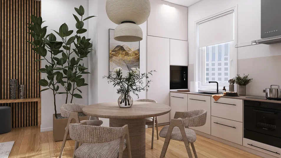 During the renovation of a 19th-century apartment, we removed the wall between the kitchen and living room, creating a spacious and bright living room-dining room-kitchen space.