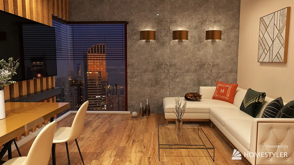 Beton architektoniczny. Lamele. Złoty salon z kuchnią. Ciemna kuchnia. Elementy zielonego.