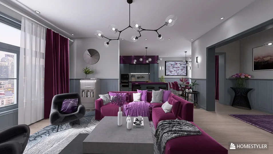 This stunning open space features a seamless integration of the living room, dining area, and kitchen, embodying modern classic style. The design showcases a sophisticated palette of grey and black, elegantly complemented by luxurious plum and violet accents. Clean lines and refined furnishings create a harmonious atmosphere, making this area perfect for both relaxation and entertaining.