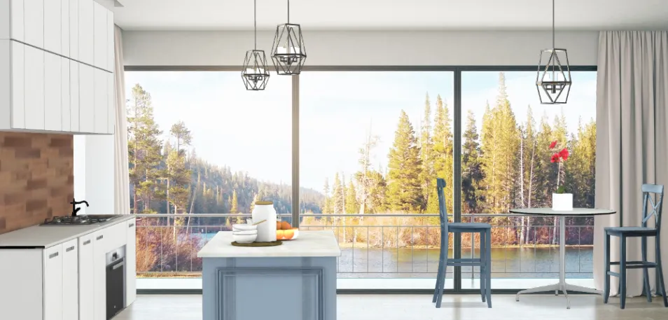 A Room containing blues, and whites give the room some color while still being simple and that complements the veiw