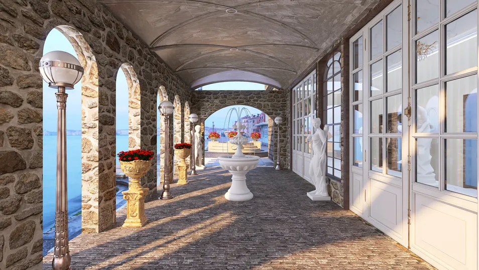 Galleria o, meglio, portico delle luci e delle ombre. La immagino nel centro storico di una cittadina italiana, ricca di arte e cultura.