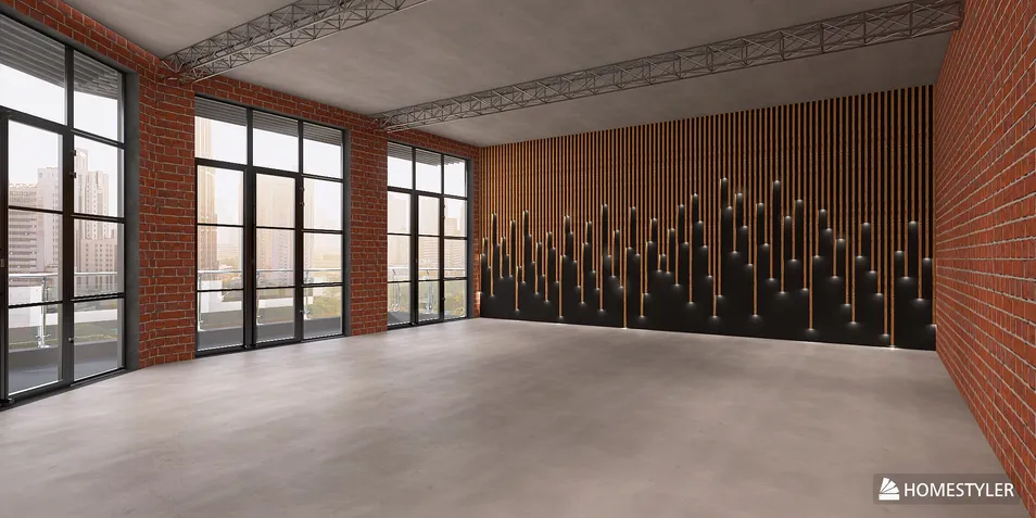 Un Loft en las alturas con un diseño industrial, resalta una pared con una iluminación con listones de madera, hormigón, cableadas de metal a la vista y ladrillo rojo completan el diseño.