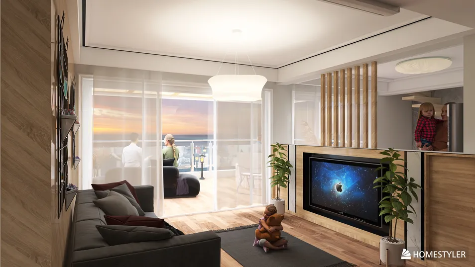 Customer requirements A cool room image I want the living/dining/kitchen area and balcony to have a unified image The bedroom has a warm image I want some kind of design underneath To create a cool room, we used mainly black furniture. The image of the living, dining, and kitchen area and the balcony being integrated was achieved by placing the sofa on the balcony, reducing the sense of distinction between the two. Warm colored lights were used in the bedroom to recreate a warm image. Plants were placed in the hallway to improve its appearance. The living, dining, and kitchen area can be seen from the kitchen.