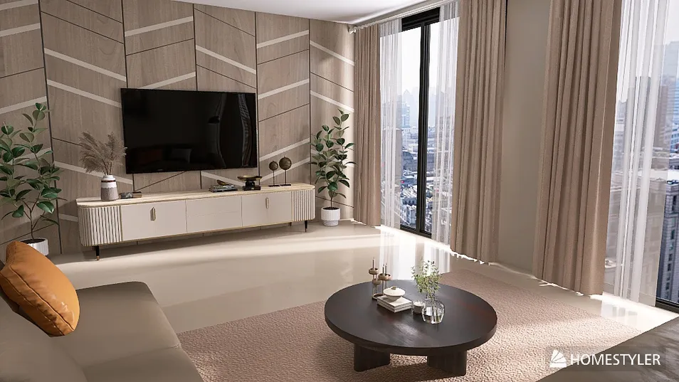 The walls are painted in a delicate Mocha Mousse, creating a warm and sophisticated atmosphere. One of the main walls is decorated with an elegant three-dimensional wooden panel. Detailed Description: Decorative Wall: The wall behind the TV is covered with light wood panels featuring a diagonal geometric pattern, adding depth and character to the space. TV Console: A low-profile light wood cabinet with fluted doors and gold accents supports the wall-mounted TV. It is decorated with small objects such as vases, sculptures, and books, giving it a refined touch. Sofa: A brown leather sofa with cushions in warm shades like caramel. Coffee Table: A round dark wood coffee table with a matte finish sits at the center of the room, adorned with candles, a tray, and a small vase with green branches. Lighting & Curtains: Large windows allow plenty of natural light to enter, while long, soft brown fabric curtains add elegance and gently filter the light. Both sheer and heavier curtains are present. Natural Elements: Two potted green plants on either side of the TV console bring freshness and contrast beautifully with the neutral tones. Flooring & Rug: The light, glossy floor reflects the light, while a soft light brown rug defines the living area. The space is warm, inviting, and modern, blending natural materials, soft textures, and elegant details. The contrast between wood tones, gold accents, and neutral surfaces creates a harmonious balance of comfort and sophistication.