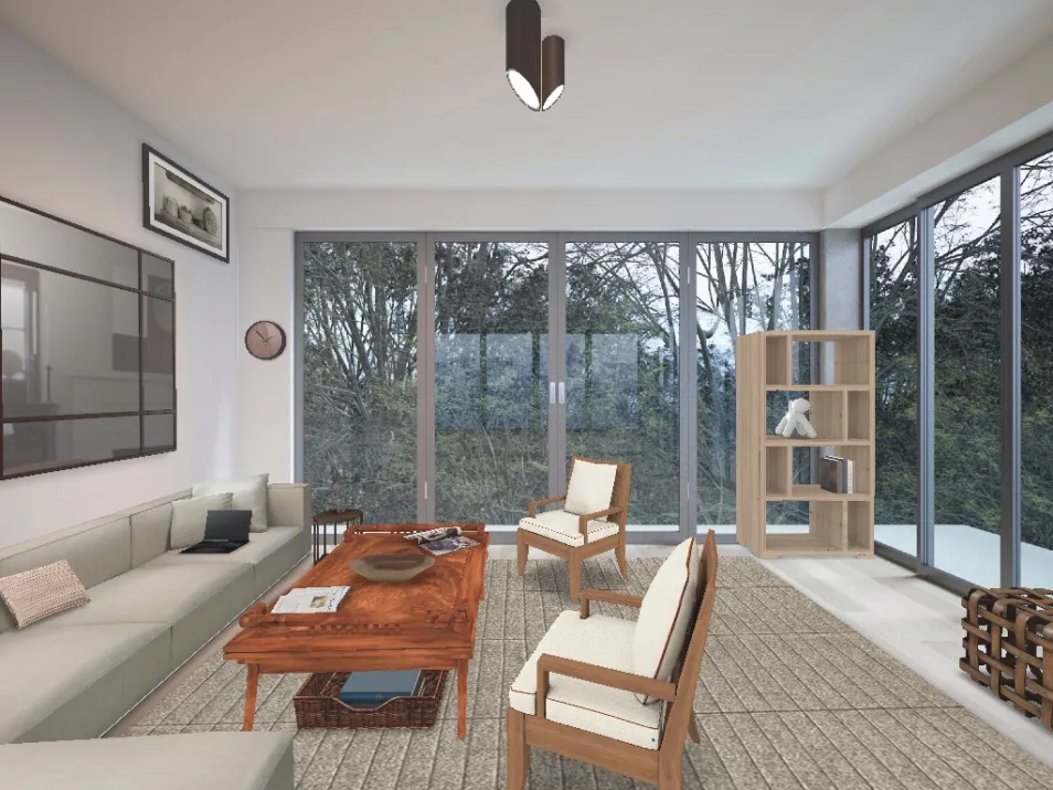 A modern cabin room with a serene outlook of the forest coupled with a clear skies and winter animals, but the room is the crown on top with a theme of brown contrasting a white wall.