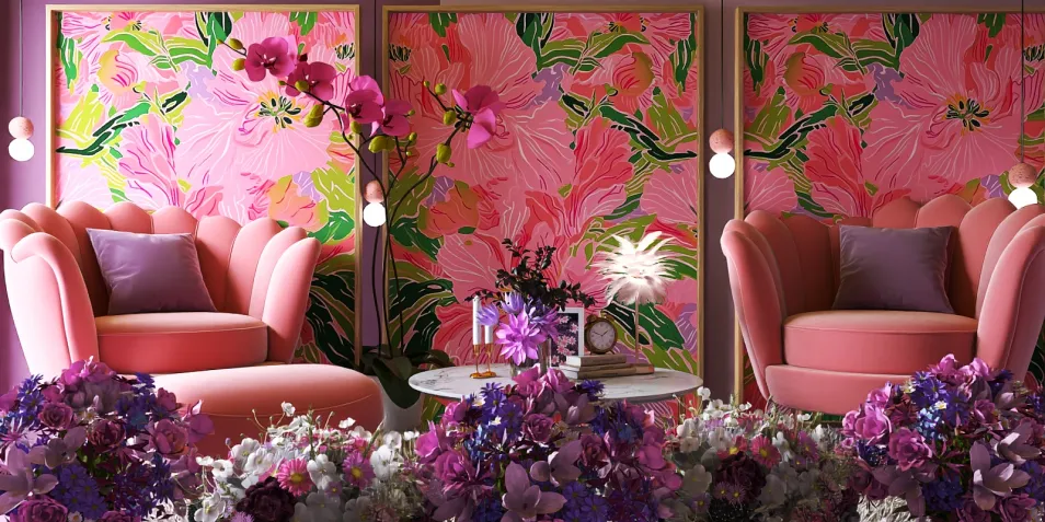 @rodriguezgilyunet En un espacio donde las paredes susurran flores en tonos vibrantes, los sillones se abrazan en un diálogo de terciopelo y luz. Aquí, cada pétalo es una promesa, cada sombra una interpretación de lo no dicho, como en las ciudades invisibles que habitan nuestra memoria.