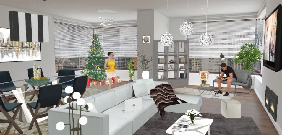 Sala de jantar e estar moderna em tons de branco e preto lareira TV com cantinho de leitura