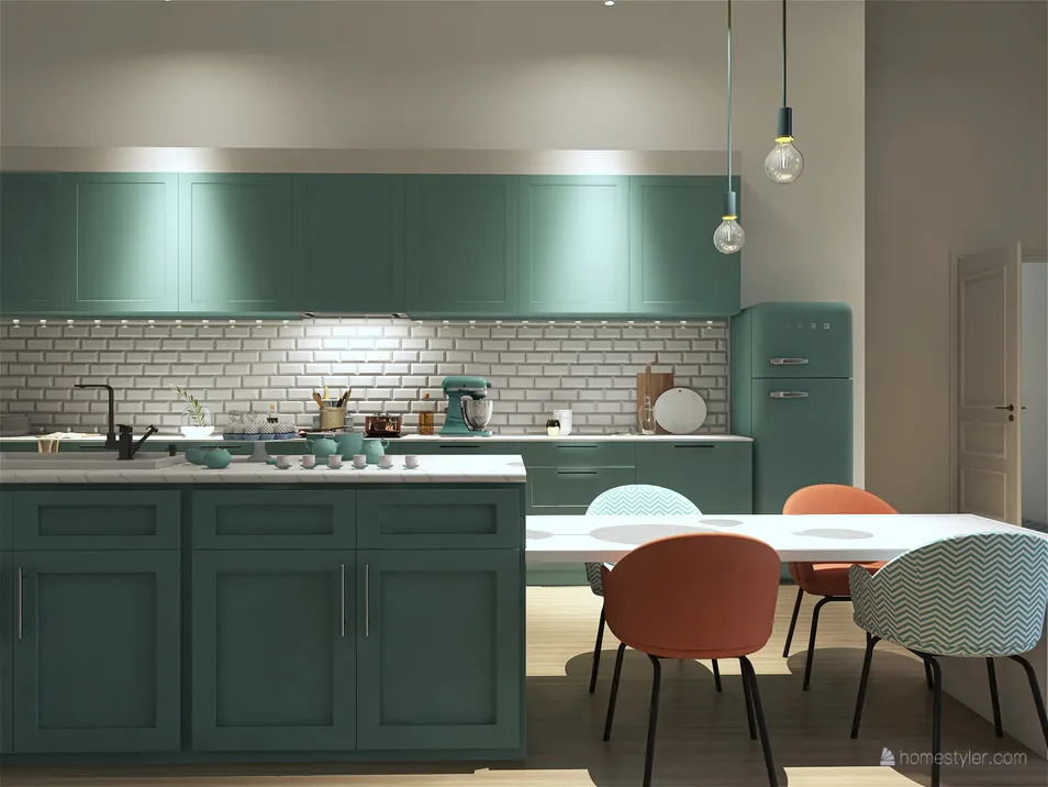 Diseño interior de pequeña vivienda rústica con toques mediterráneos. La paleta de colores elegida para el diseño son el color verde turquesa como protagonista, fresco y relajante, combinado con tonos grises y pinceladas de color naranja.