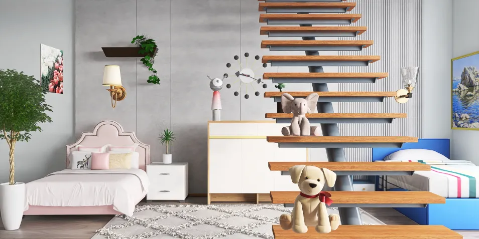 Twins live in the same room. And they have different interests, different tastes in colors. So I decided to make their room in that style.