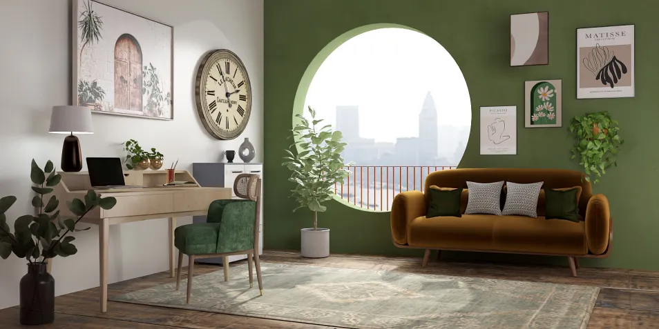 It has been so long since I’ve been on here! This beautiful office showcases the big circular window that gives such a pretty city view. It has an accent wall of a beautiful green, and plants all around to complement that. Also a nice upgrade from my last office. I had so much fun picking out all the artwork, and I hope you enjoy this neutral-green office💚