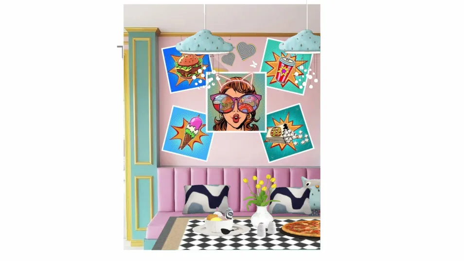 New diner in a small town. Well-known for its delicious ice creams with multicolored wafers, feature wall art and quirky cloud shaped overhead lights with simulated raindrops.