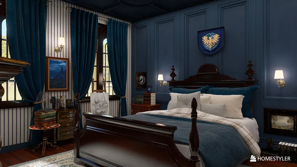 About the project: For this bedroom, inspiration was taken from the Ravenclaw house, represented by the color blue, which symbolizes wisdom, creativity and intelligence in the Harry Potter universe. The room was designed to reflect the atmosphere of study and contemplation, characteristic of Ravenclaw students, using deep blue tones that evoke an elegant and tranquil space.The classic design, with dark wood details and a more traditional style, was chosen to evoke the sophistication and intellectual atmosphere of the house. Decorative elements such as books, paintings and sculptures reinforce the theme, creating a space that inspires both relaxation and study and the search for knowledge, central elements of the Ravenclaw philosophy.