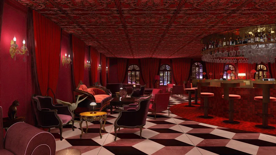 Inspired by Pinterest's predictions that 2025 will see trends towards a revival in the Rococo style and deep cherry red will become a popular colour choice, this small but cozy bar combines the two themes. Rococo and contemporary elements are combined for an up to date style, and the entire space in colour drenched in cherry red variants with golden accents.