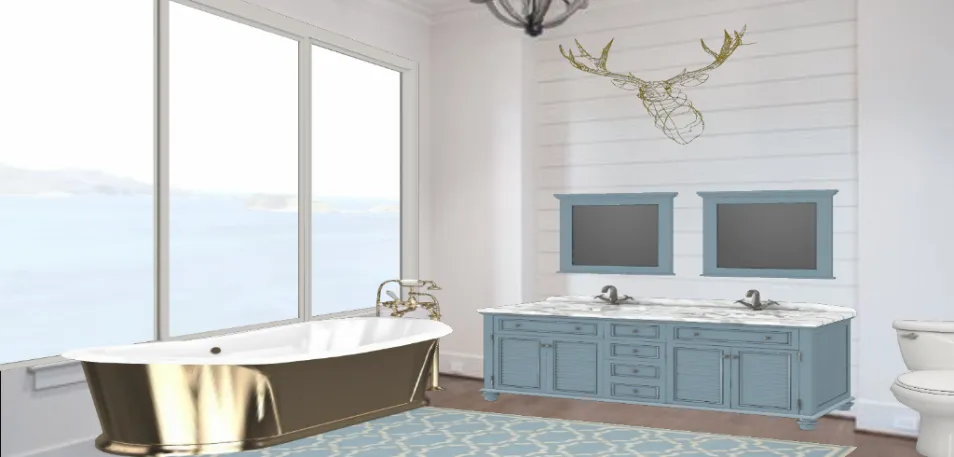 Simple blue vanity and gold bathtub bring slight rustic feel to this beautiful oasis